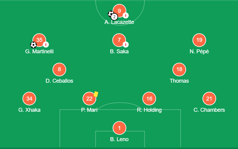 Arsenal built in a 2-3-5 with Rob Holding (not in the picture) being situated out wide as there was an overload by Sheffield United in case Arsenal lost the ball. Arsenal built in a 2-3-5 as Sheffield United had bad attackers, and having the extra man in midfield makes sense due to the extent to which Arsenal controlled the game. Granit Xhaka slots into the LCM position as there’s more space for him to spray out the ball, either switching play to Saka/Pépé or playing the ball over to Alex Lacazette. Partey takes up the RCM spot as he’s able to evade the 2 men looking to press him when he receives the ball & Ceballos is situated as the deepest player as there is room for him to progress the ball when he gets it.